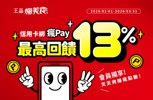#王品集團 #王品瘋美食 #瘋Pay #瘋點數 #最高13%回饋 #1點抵1元 #會員好康 #限量額滿為止